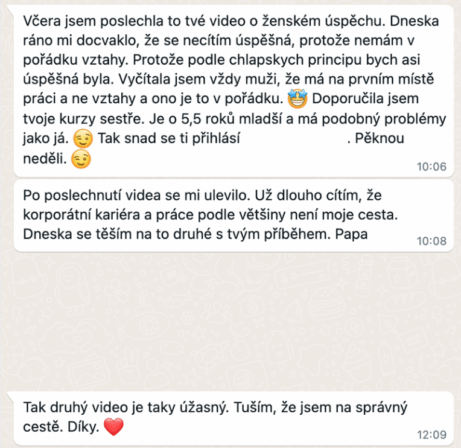 A tam jsem začala stavět svůj úspěch na základě toho, co já jako ŽENA v této společnosti potřebuji. Co mě podpoří. Co JÁ SAMA považuji za úspěch bez požehnání kohokoliv.